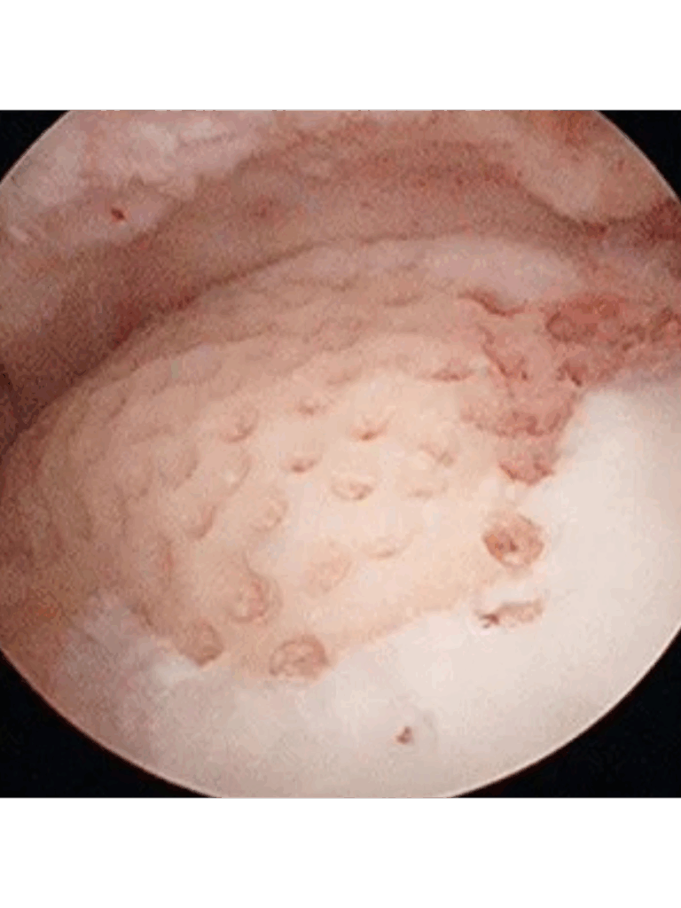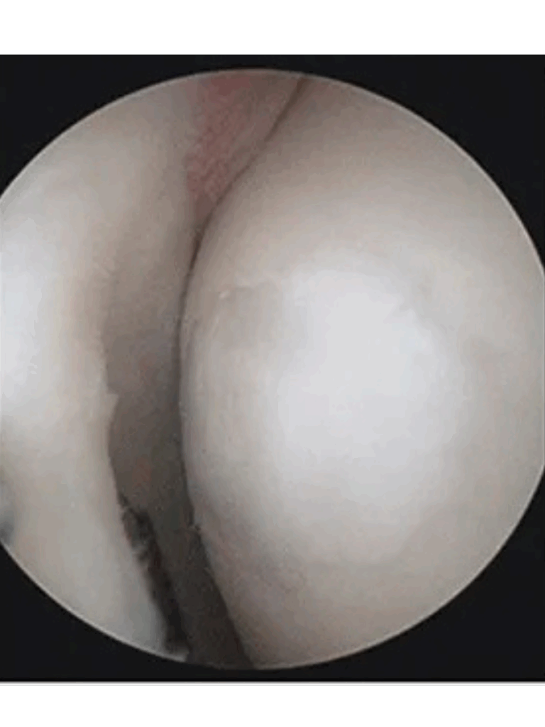 You can see a “Swiss cheese” pattern either from natural wear and tear or from small drilled holes during a microfracture procedure, often performed by an ortho and not something we recommend. This is the body’s way of trying to heal by stimulating new tissue growth, but the new tissue is usually much weaker than the original cartilage.